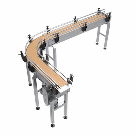 A 90-degree curved conveyor is used when you need to change the product's direction within the line (right/left) while maintaining smooth flow and minimizing bottlenecks. It typically features an anodized aluminum frame with adjustable bend angles (such as 45°/90°/180°) to suit the plant layout. Some heavy-duty industrial models support loads of up to approximately 227 kg and speeds of up to approximately 122 m/min (depending on specifications), making them suitable for continuous production lines and packaging and handling applications.