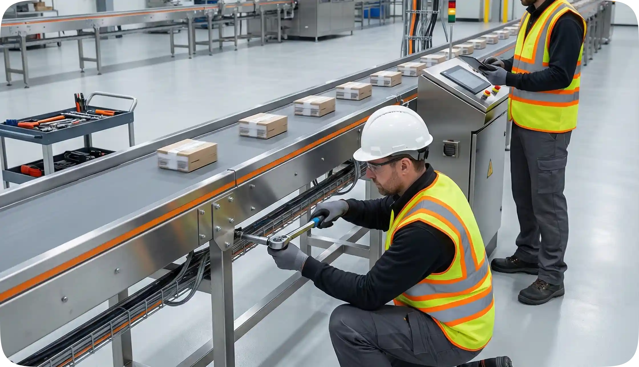 We handle the complete installation of conveyor and handling systems at your site, from structural installation and leveling to electrical connections and commissioning. We test the lines under actual load, adjust speeds and operating sequences, and train your team on the safe and daily operation of the system.Maintenance and technical support